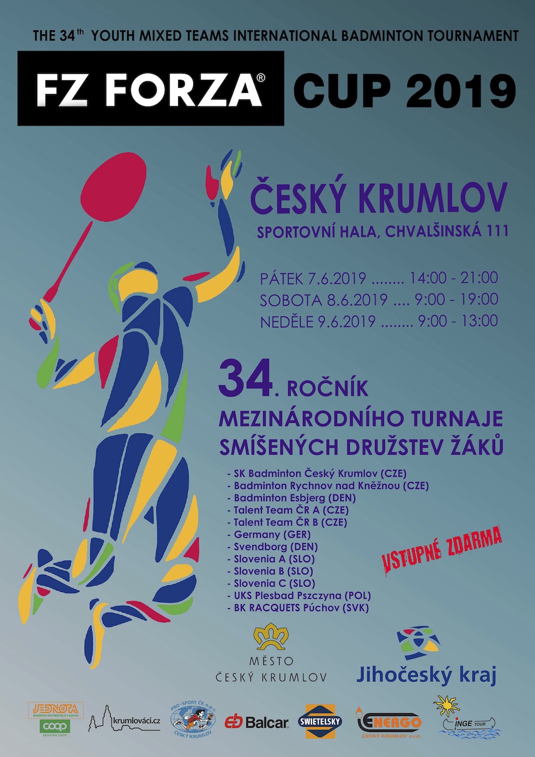 Zanimiv ekipni turnir se prične danes ob 15 uri in bo trajal do nedelje, 9. junija 2019. Sodelujejo ekipe SK Badminton Češky Krumlov, Badminton Rychnou nad Kneznov (Češ), Esbjerg (Dan), Svendborg (Dan), Talent Team Češke A, Talent Team Češke B, reprezentanca Nemčije, UKS Plesbad Pszczyna (Pol), BK Racquets Puchov (Slovaška) ter Slovenija A, Slovenija B in Slovenija C.  Naša reprezentanca bo nastopila v naslednjih postavah: