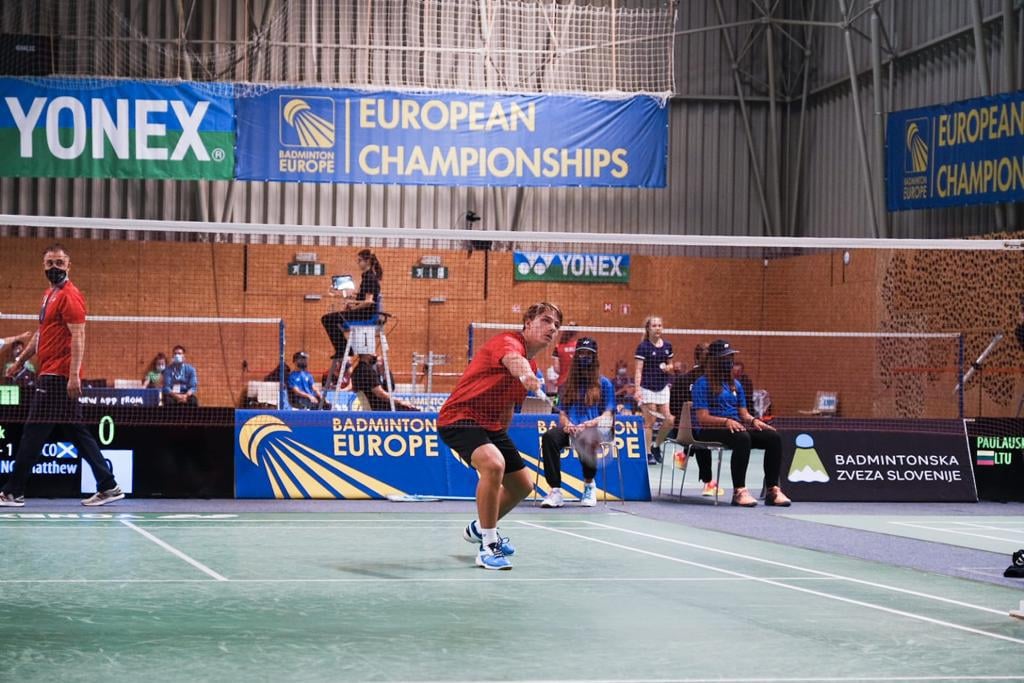 V prvi tekmi sta mešanih dvojicah za Slovenijo nastopila Žiga Podgoršek in Nika Bedič. V treh setih sta bila boljša Škota Josh Taylor in Brooke Stalker, ki sta zmagala z rezultatom 21:19, 13:21 in 13:21. Nato je v posamični konkurenci Mark Koroša odlično začel tekmo proti Matthewu Waringu in dobil prvi set z izidom 21:19. V drugem setu mu je zmanjkalo koncentracije in škotski igralec je zmagal z 18:21. Tretji set je bil mnogo bolj prepričljiv Waring, ki je zmagal z 9:21 in tako reprezentanco Škotske popeljal do vodstva z 0:2.