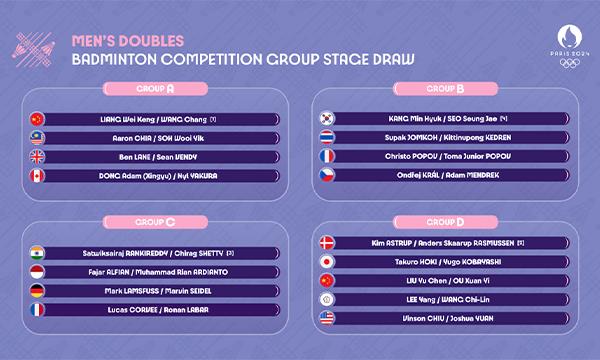 Ker je bila naknadno v žreb dodeljena 17. dvojica v moških dvojicah (Ronan Labar/Lucas Corvee), so žreb opravili nekoliko kasneje. Skupina D ima tako 5 dvojic namesto štirih. Iz vsake skupine se v četrtfinale uvrstita po dve najboljši dvojici.   MOŠKE DVOJICE Skupina A: Liang Wei Keng / Wang Chang [1] (Kit) Aaron Chia /…
