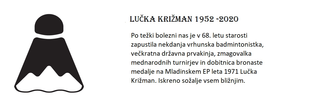 V 68. letu starosti je po hudi bolezni umrla nekdanja vrhunska badmintonistka Lučka Križman. Bila je večkratna državna prvakinja, zmagovalka mednarodnih turnirjev in dobitnica bronaste medalje med posameznicami na mladinskem evropskem prvenstvu leta 1971.